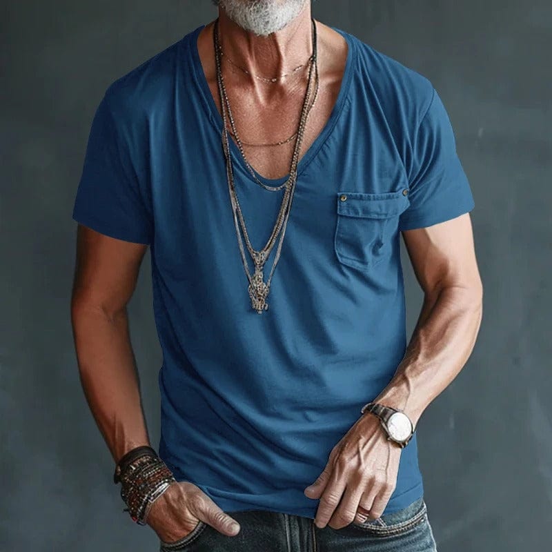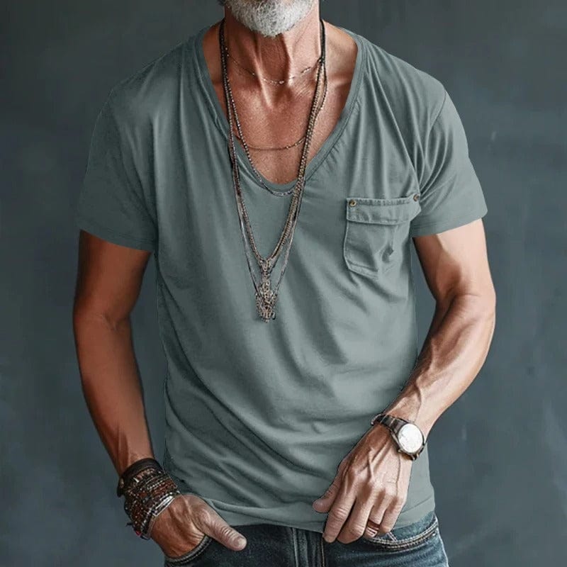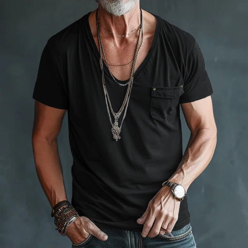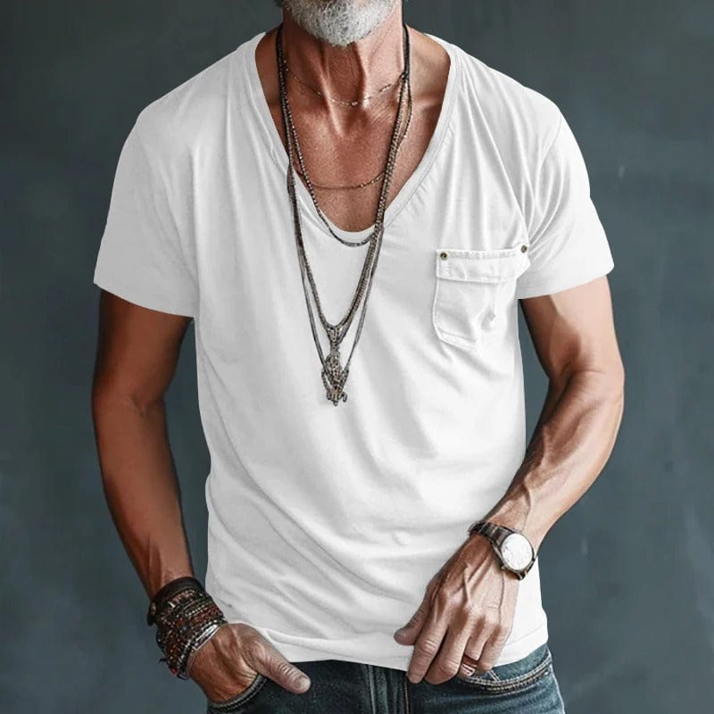 • Effortlessly stylish with a relaxed neckline and raw-edge pocket.